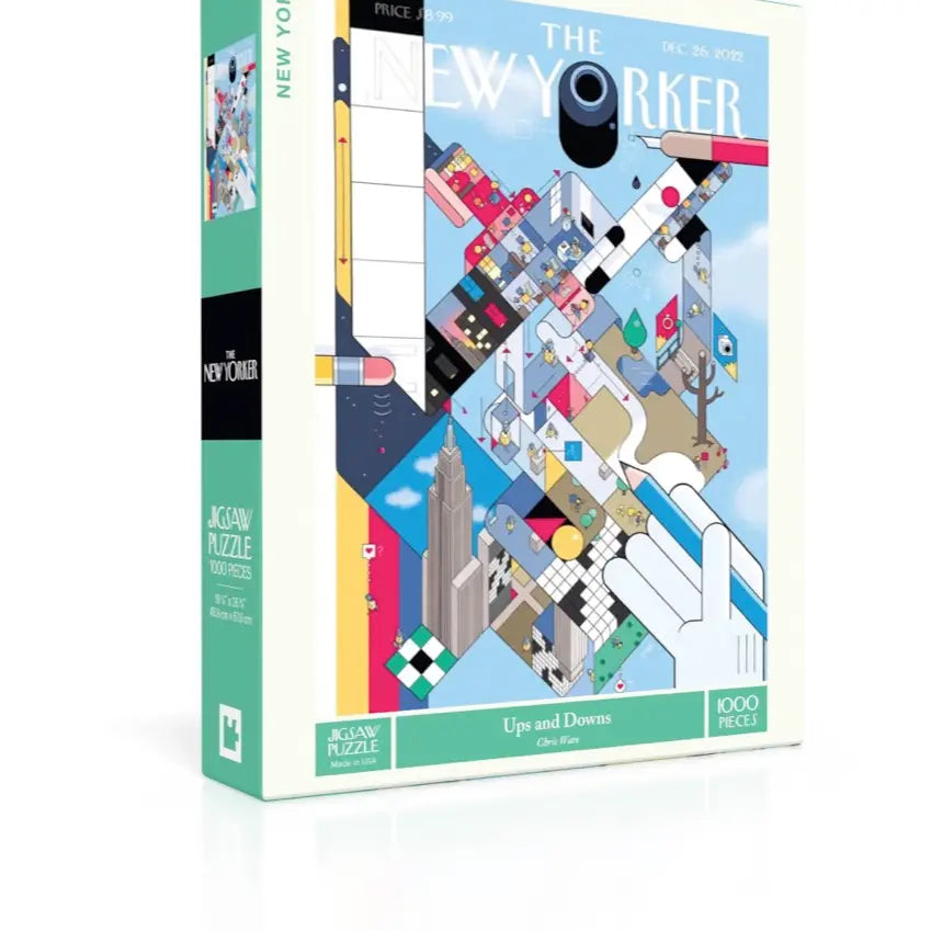 The December 26, 2022, cover of The New Yorker celebrates the magazine’s Puzzles Issue with a striking isometric illustration. This surreal cityscape blends elements of New York City—featuring the Empire State Building, office cubicles, and abstract urban scenes—with visual nods to classic puzzles, including crossword grids, Sudoku-style patterns, and mazes. A giant hand holding a pencil looms over the intricate world, reinforcing the theme of problem-solving and creativity. The dynamic, geometric composition combines architecture, logic games, and artistic storytelling in a visually engaging design.
