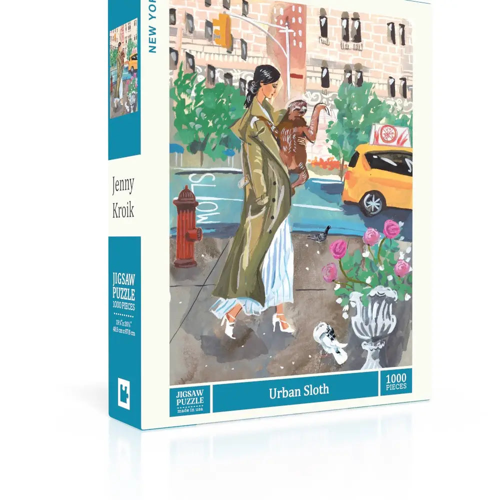 Take a stroll through a bustling urban landscape with the Urban Sloth 500 Piece Jigsaw Puzzle, illustrated by the talented artist Jenny Kroik. This delightful puzzle captures the charm of a young woman, fashionably dressed and exuding city chic, as she walks through a lively springtime scene carrying her adorable pet sloth.