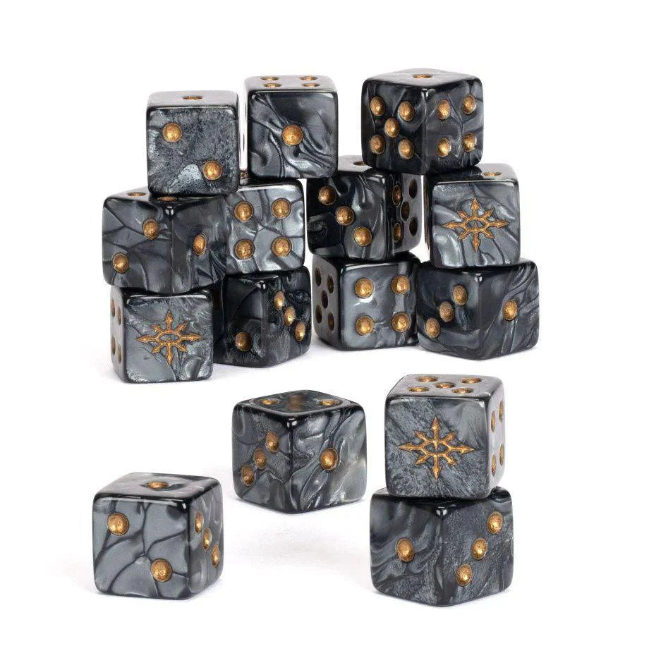 This set includes 15 six-sided, square-edged dice that measure 16mm along each edge. They are cast in black with a subtle pearlescent swirl, featuring pips in an aged metallic gold ink and the icon of the Black Legion - an eye transposed over an eight-pointed star - on the 6 face.