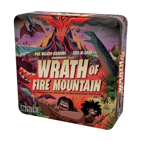 GREAT VALUE: Wrath of Fire Mountain includes 44 cave people, 16 dinosaur figures with 16 bases, 7 dice, 3 volcano map tiles, 1 volcano base, 16 dinosaur cards, 15 map tiles, 4 reference cards, 1 gameboard in a collectible tin.